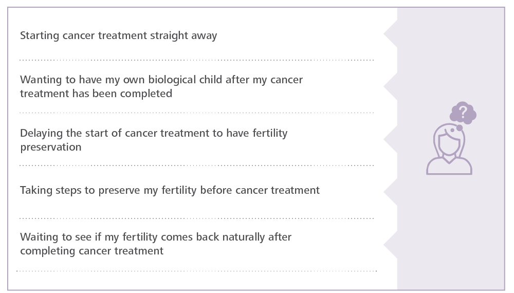 When deciding to have, or not have, fertility preservation before cancer treatment, you may want to read each of the five statements below and think about them according to what matters most to you. For example:
