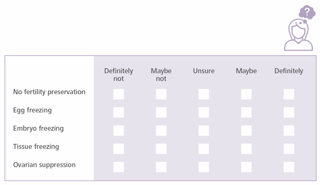 Note: If you would like to write down your responses on a printed version you can download this as a PDF here. For a printed version of the full Cancer, Fertility and Me patient decision aid you can also download this here.