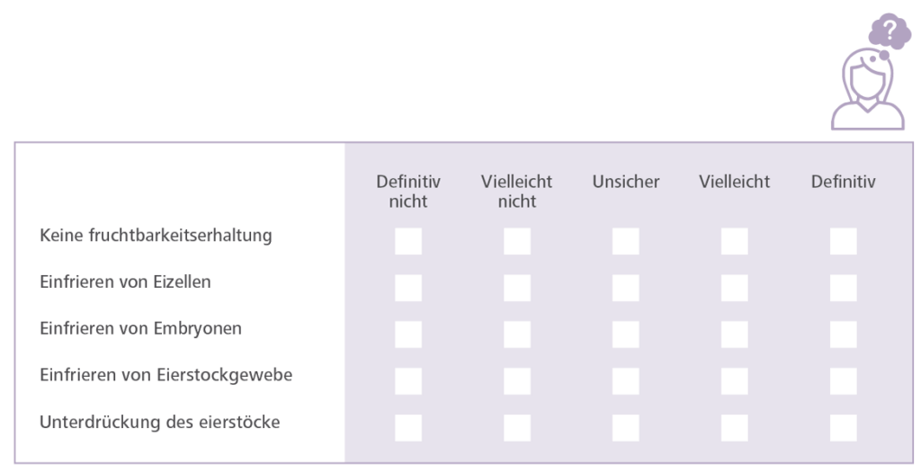 Hinweis: Wenn Sie Ihre Antworten auf einer gedruckten Version niederschreiben möchten, können Sie diese hier als PDF herunterladen. Eine gedruckte Version der vollständigen Entscheidungshilfe für Patienten zum Thema Cancer, Fertility and Me können Sie auch hier herunterladen