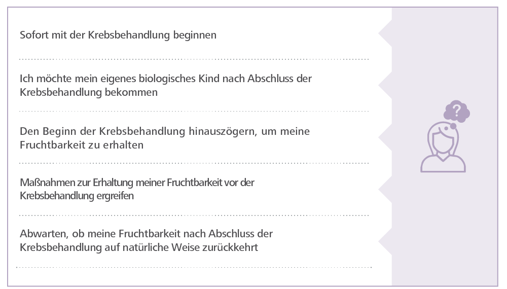 • Eine Krebsbehandlung beginnen möchten, ohne eine Behandlung zum Erhalt Ihrer Fruchtbarkeit durchzuführen.