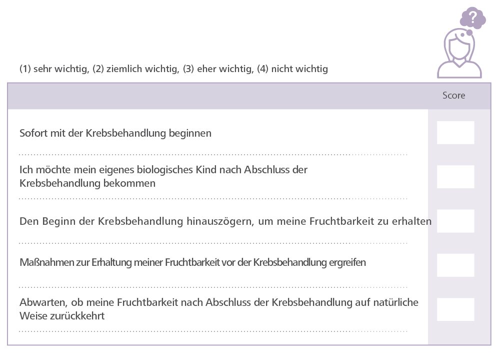 Wenn Sie sich für oder gegen eine Fruchtbarkeitserhaltung vor einer Krebsbehandlung entscheiden, sollten Sie jede der fünf folgenden Aussagen lesen und darüber nachdenken, was Ihnen am wichtigsten ist. Es kann hilfreich sein, wenn Sie die Gründe für Ihre Antworten aufschreiben Es kann hilfreich sein, wenn Sie diesen Fragebogen gemeinsam mit Ihrem Krebsteam und Ihrem Fertilitätsbehandlungsteam, Ihrem Partner, Ihrer Familie und Ihren Freunden ausfüllen.