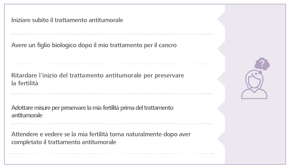 Alcune donne sanno per certo se vogliono intraprendere la conservazione della fertilità. Altre donne trovano più difficile prendere questa decisione. Non esiste una decisione “giusta” o “sbagliata”. La decisione dipende da cosa è più importante per te in questo momento. Dipende dai piani che hai per la tua vita, dopo il trattamento antitumorale.