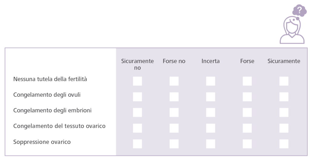 Nota: se desideri annotare le tue risposte su una versione stampata, puoi scaricarla come PDF qui. Per una versione stampata dell’aiuto decisionale completo per le pazienti Cancro, Fertilità e Me, puoi anche scaricarlo qui.