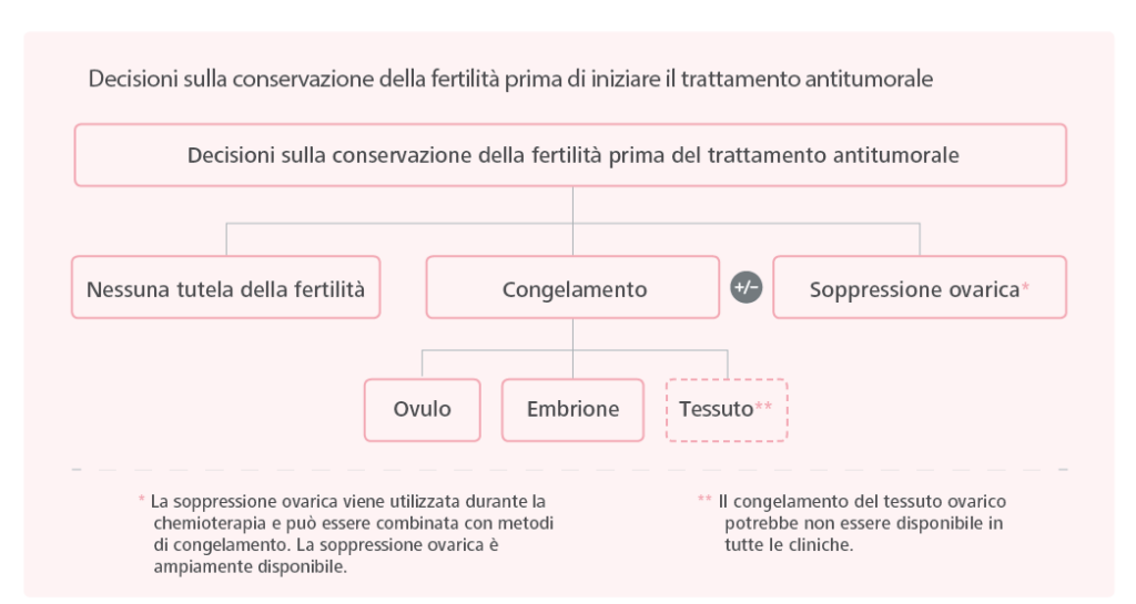 L’immagine sotto illustra le decisioni sulla fertilità a cui le donne devono pensare prima di iniziare i trattamenti antitumorali. Non tutte le procedure sono disponibili in ogni clinica per la fertilità. Alcune sono tecniche più recenti e non hanno ancora dimostrato di avere successo su ampi gruppi di pazienti.