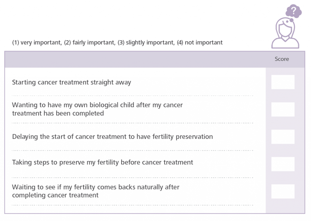 Completing this task may help you think about which fertility preservation option best suits you and your lifestyle at this time. It might be helpful to talk about your choices with your cancer care team and fertility care team, partner, family and friends.